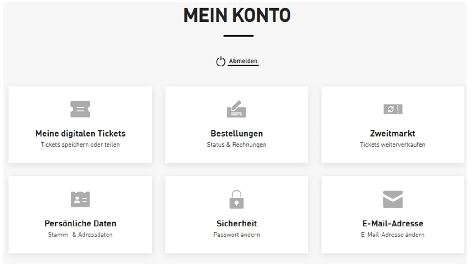 Auf dem Ticketonlineshop angekommen, sollten Sie nun automatisch angemeldet sein. Klicken Sie oben rechts auf „Mein Konto“. Falls Sie nicht automatisch angemeldet wurden, klicken Sie auf „Anmelden“ und geben Sie Ihre Login-Daten ein. Klicken Sie nach dem manuellen Login auf „Mein Konto“.