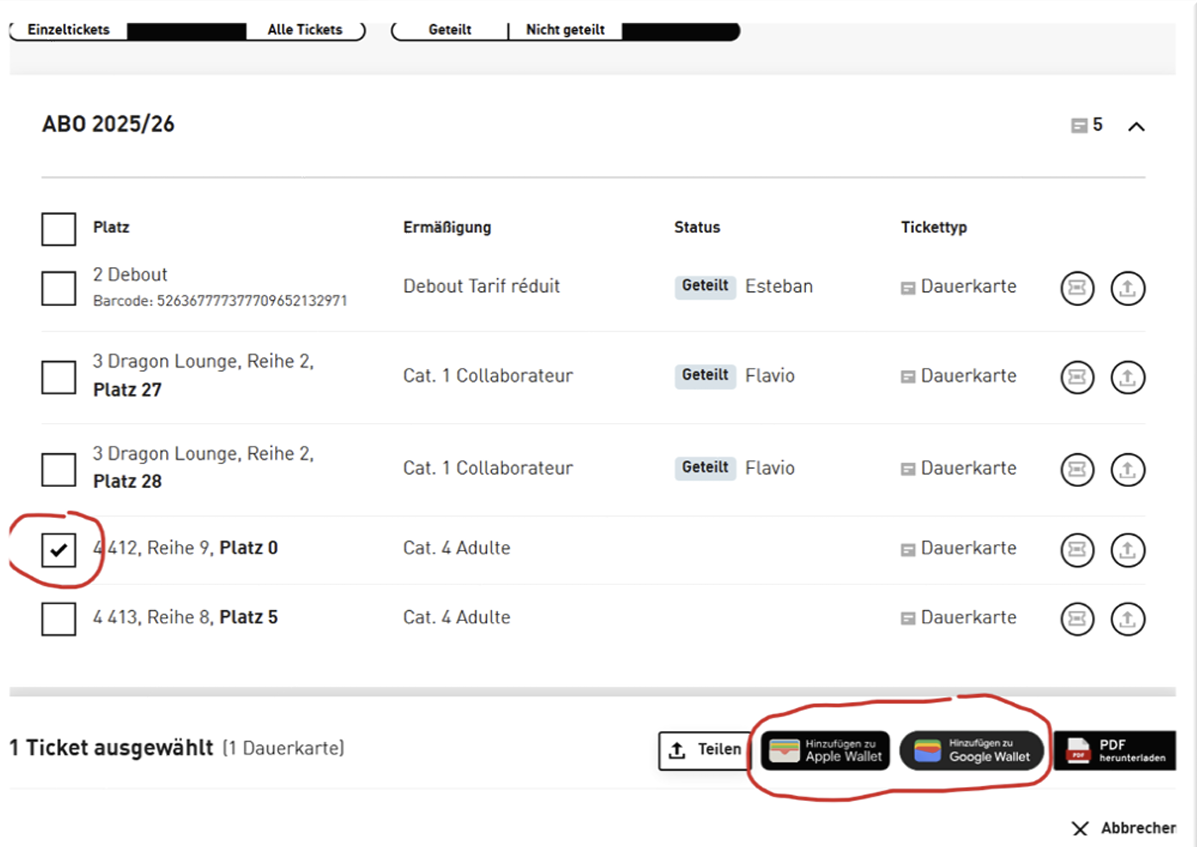ACHTUNG: Da es sich beim Teilen eines Abos um eine 1:1 Kopie handelt, teilen Sie Ihr Abo nur mit Personen, welchen Sie hundertprozentig vertrauen! Verwenden Sie ansonsten die Funktion „Einzeltickets teilen“!