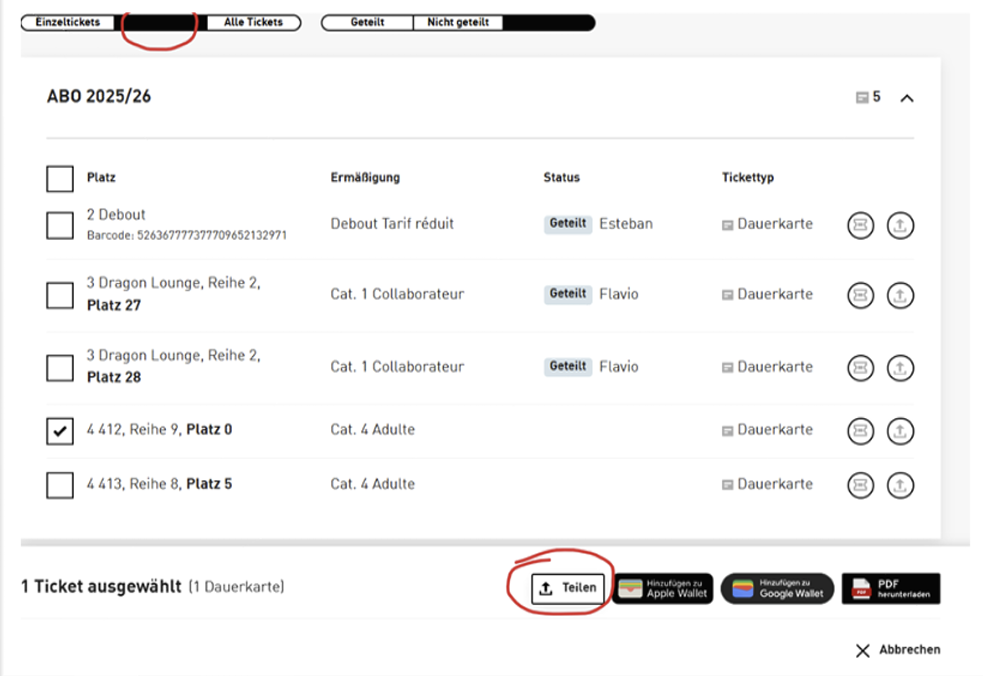 Achtung: Sobald Sie bei der Einzelkarte auf „Teilen“ klicken, wird Ihr Abo für das entsprechende Spiel ungültig und durch das Einzelticket ersetzt! Dieser Schritt kann nicht rückgängig gemacht werden.