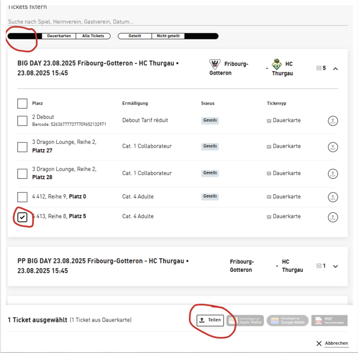 Falls Sie das Abo für die ganze Saison mit jemandem teilen möchten, wählen Sie „Dauerkarten“ und das gewünschte Abo aus und klicken Sie auf „Teilen“.