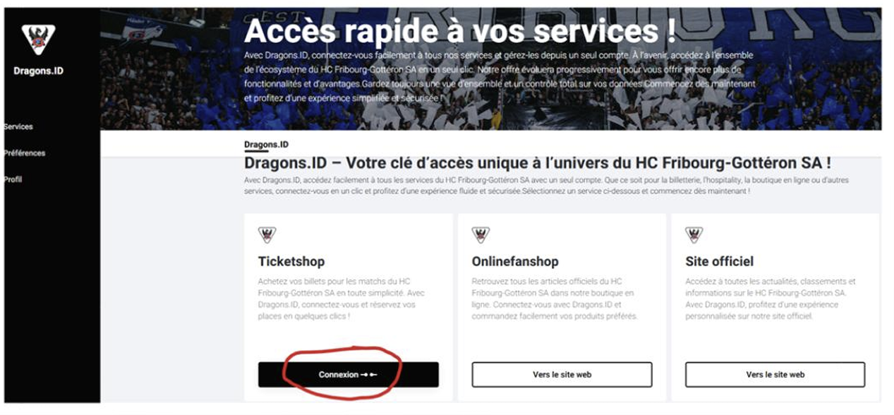 Connectez-vous sur la plateforme SSO :https://id.gotteron.ch/logins et cliquez sur « connexion » dans la rubrique TICKETSHOP de votre profil.