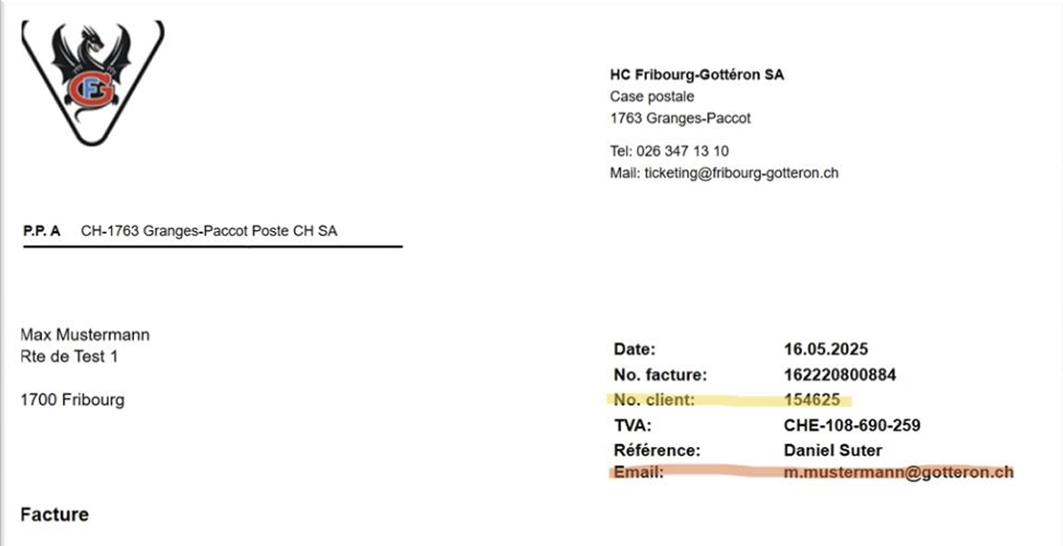 Informations complémentaires : Si l'adresse e-mail figurant sur la facture d'abonnement n'est pas correcte, contactez nous par e-mail à : support@fribourg-gotteron.ch. Veuillez mentionner votre nom et votre numéro de client afin que nous puissions vous envoyer une nouvelle invitation.